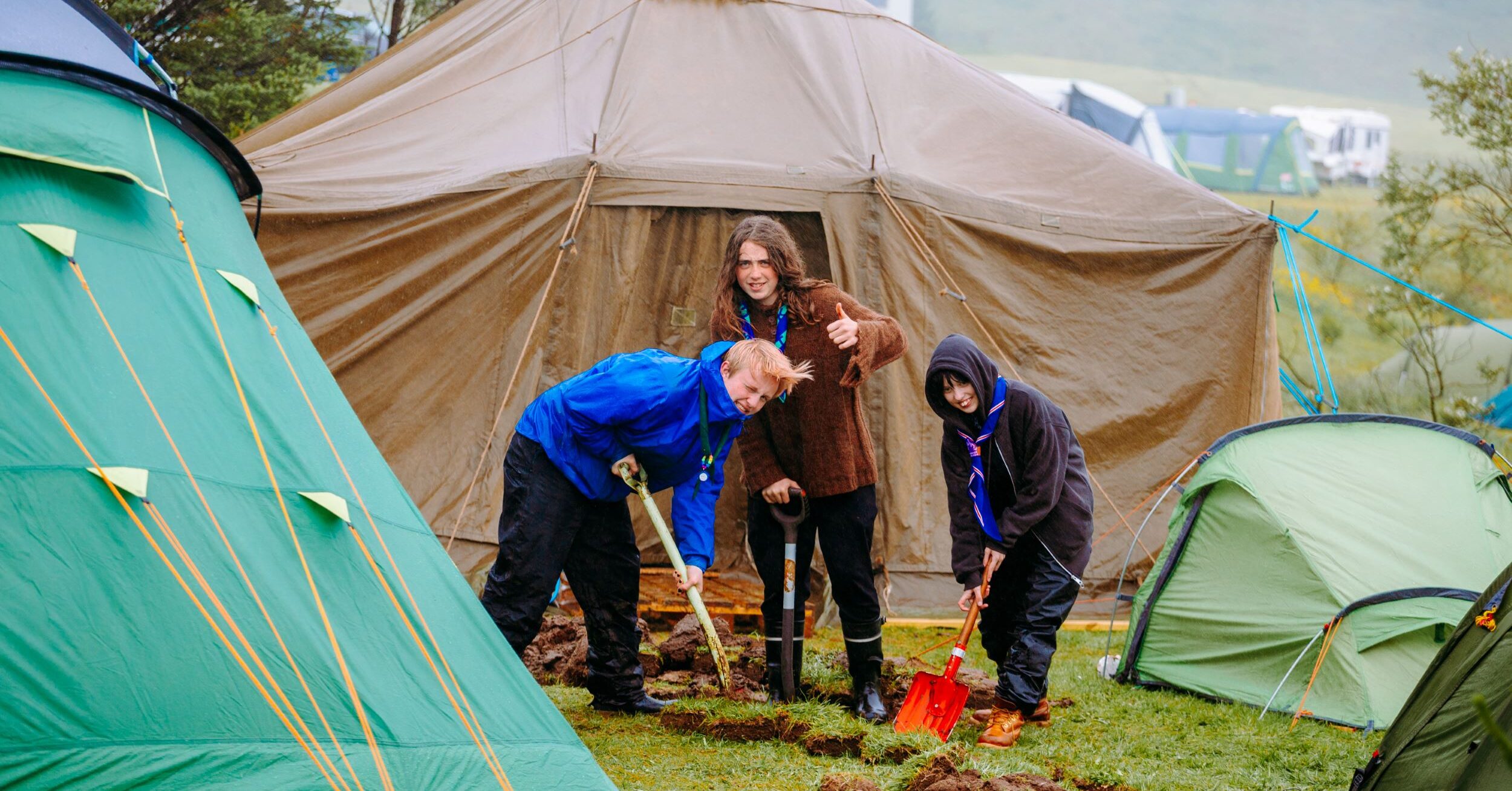 Það rigndi vel á okkur á fyrsta degi Landsmóts. Skátarnir létu það þó ekki á sig fá og komu upp tjaldbúðum, elduðu mat og skemmtu sér vel. Þegar líða fór á kvöldið bætti þó heldur í rigninguna, stórir pollar mynduðust á tjaldflötunum og sum tjöld fóru á flot. Þar sem skátar eru einkar lausnamiðaðir og hjálpsamir voru því öll stærri tjöld nýtt til þurrkunar á minni tjöldum og öðrum búnaði. Brugðið var á það ráð að moka litla skurði sem stýrðu vatninu frá tjaldflötunum.