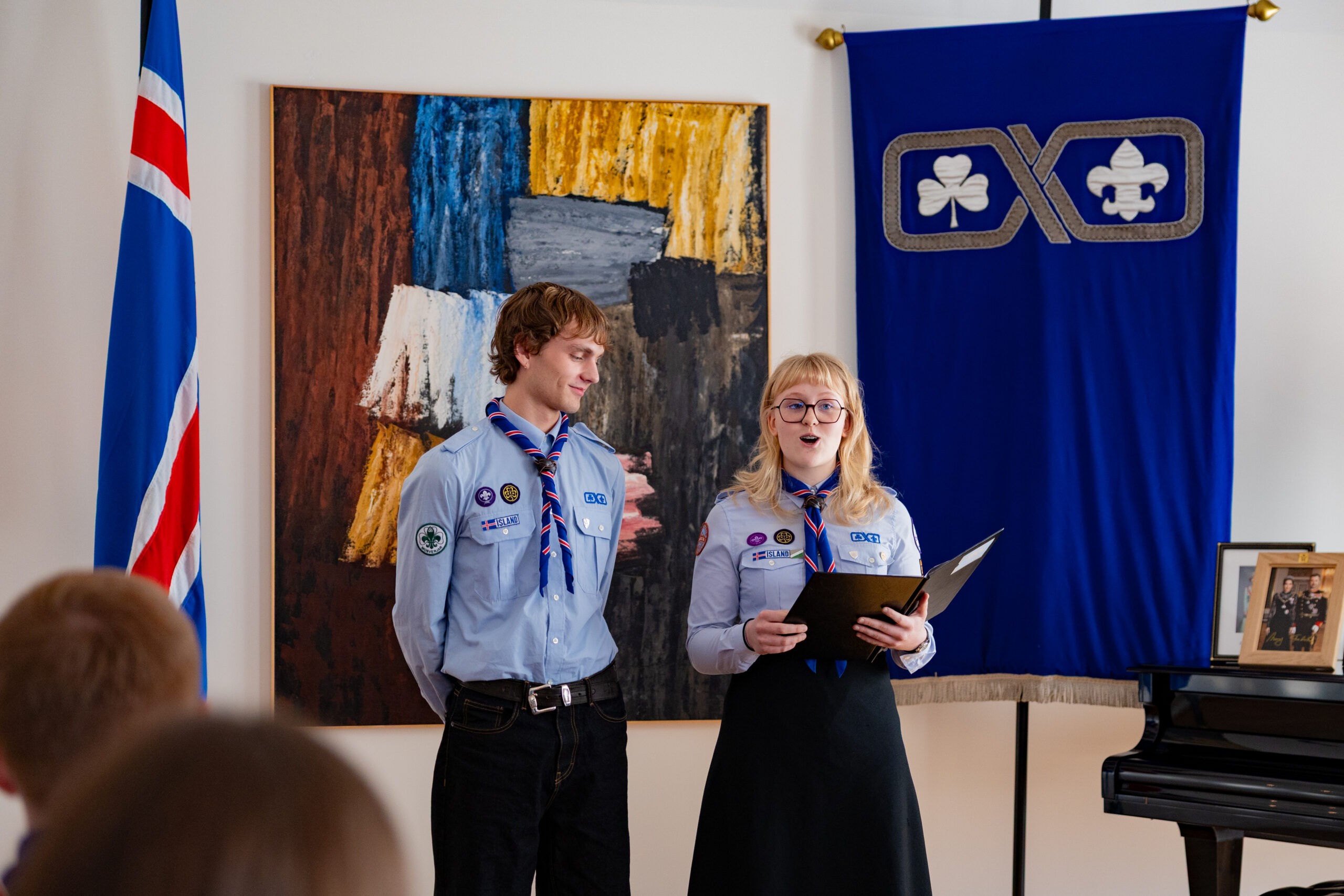 Fríða: Ég hef oft verið spurð hvað það er eiginlega sem við gerum í skátunum. Fólk virðist halda að við séum að kveikja eld og hnýta hnúta alla fundi en öll hér inni vitum við að skátastarfið er svo miklu meira en það. Skátahreyfingin er eina æskulýðshreyfingin, svo ég best viti, sem er með eitt inntökuskilyrði: Að leggja sitt af mörkum til þess að bæta samfélagið. Þótt við kveikjum vissulega marga elda þá áttar maður sig á því að skátastarfið snýst ekki bara um eldinn sjálfann, heldur um það að kveikja eld innra með sér og öðrum. Að verða forvitin, þrautseig, opin fyrir ævintýrum og tilbúin að takast á við áskoranir. Núna, þegar ég stend hér í dag, finnst mér eins og þessi eldur logi aðeins skærar.