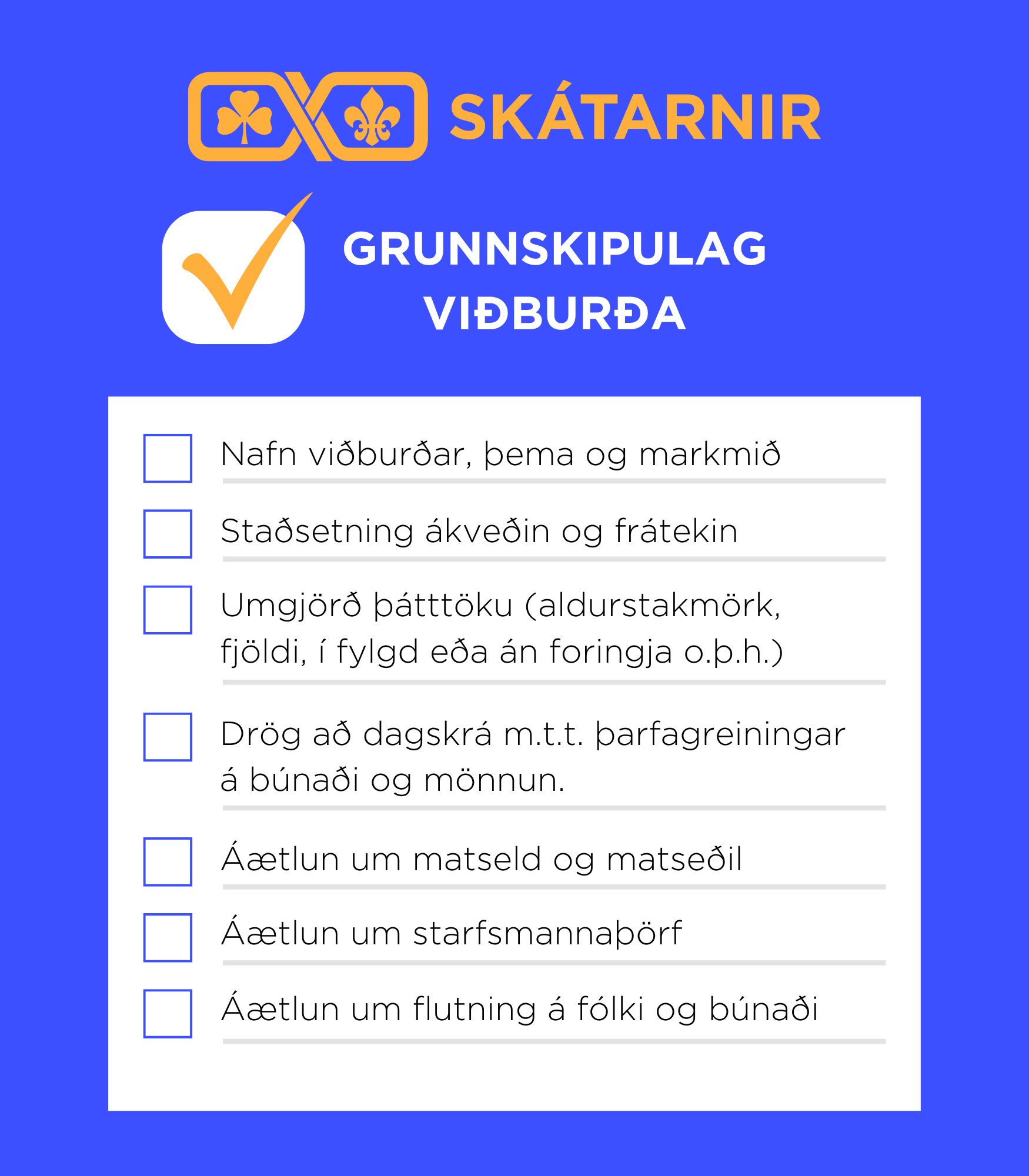 Skátaviðburðir skulu ávallt vera formlega á vegum og ábyrgð BÍS eða aðildarfélags innan BÍS sem hefur gilda skráningu félagasamtaka. Sú eining ber ábyrgð á að: