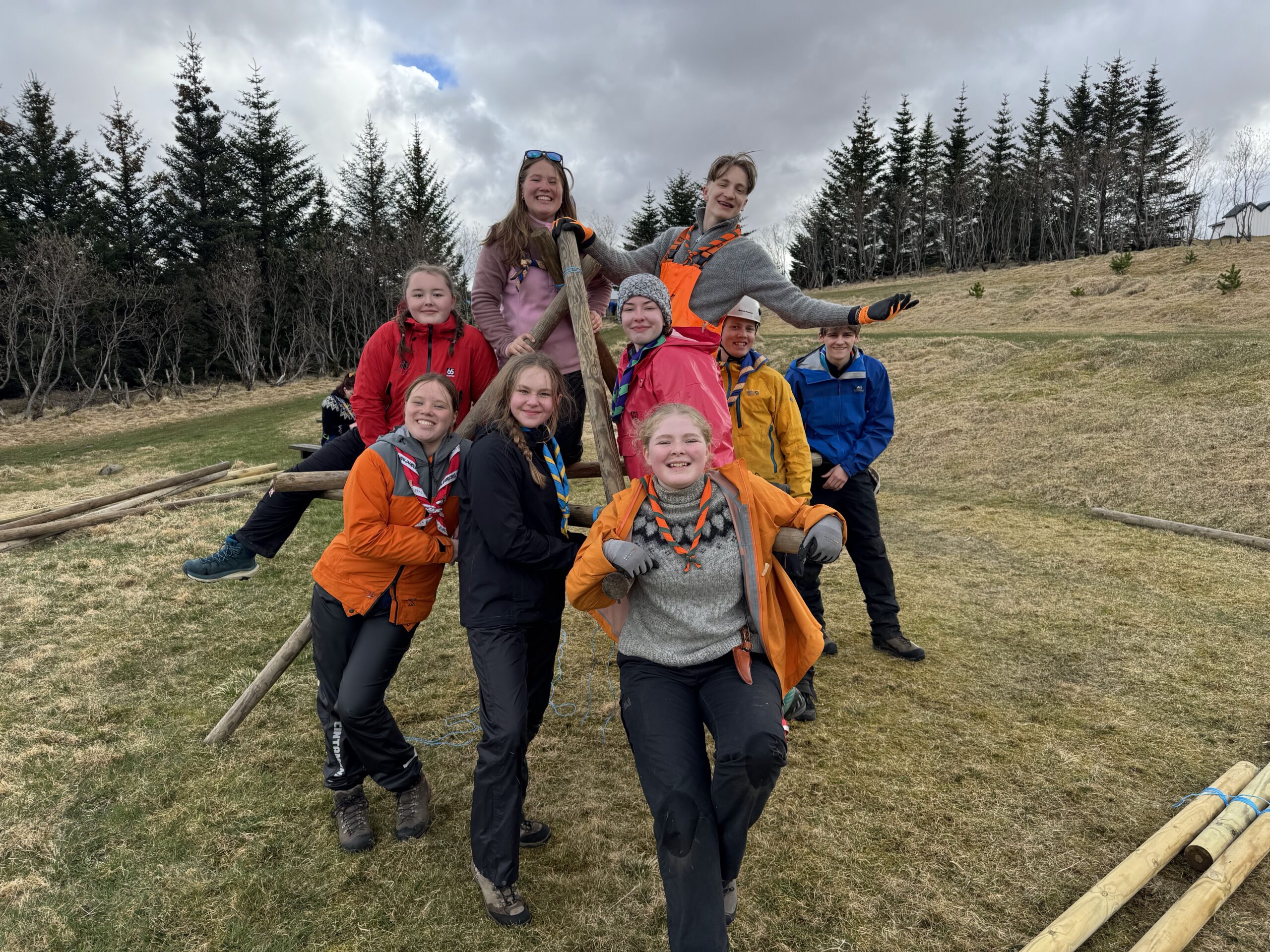 Vert er að minnast á að mikil áhersla var lögð á öryggi og flokkarnir sem voru að súrra hátt uppi voru vel tryggðir í beltum og hjálmar hafðir við alltaf þegar eitthvað átti á hættu á að detta niður á fólk. Einnig var lagt upp með að skera ekki á nein bönd, #Náttturuvinur, en til að gera það þarf að brenna endana strax og böndin eru skorin og setja smá vinnu í að leysa hnútana á sunnudeginum.