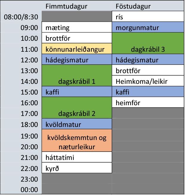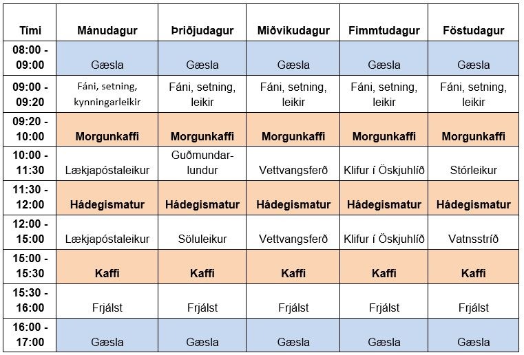 - Flokkur: Hópur þátttakenda sem starfar saman alla vikuna.