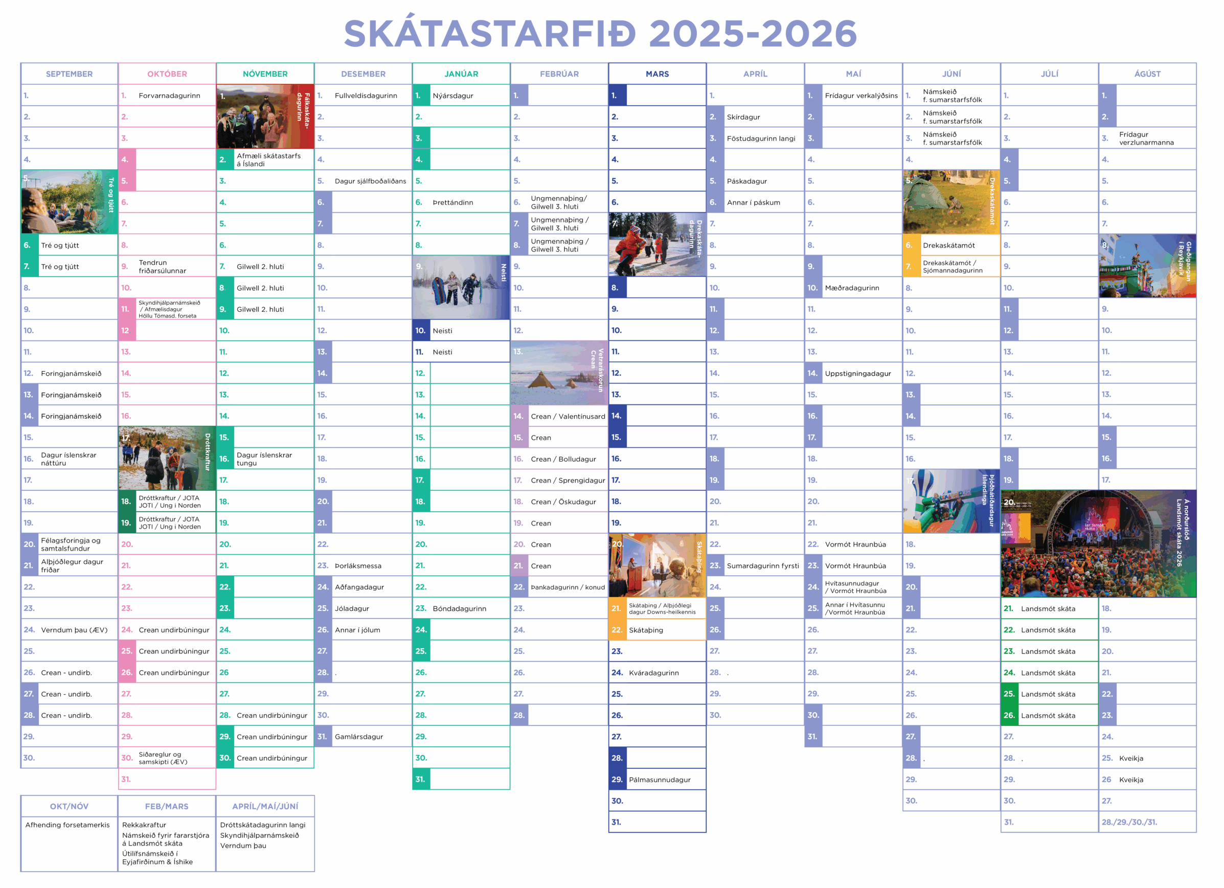 | Landsmót skáta í Svíþjóð | 25. júlí - 1. ágúst 2026 | Svíþjóð | Fálkaskátar - Róverskátar | https://jamboree.se/english/ |