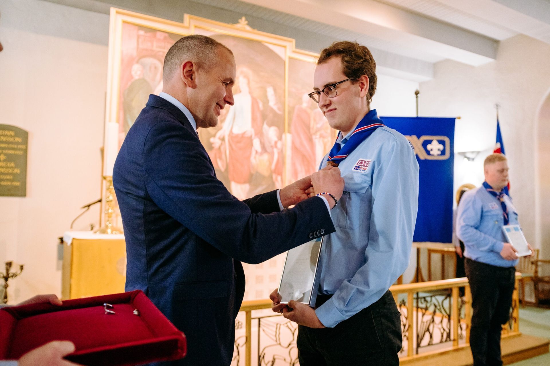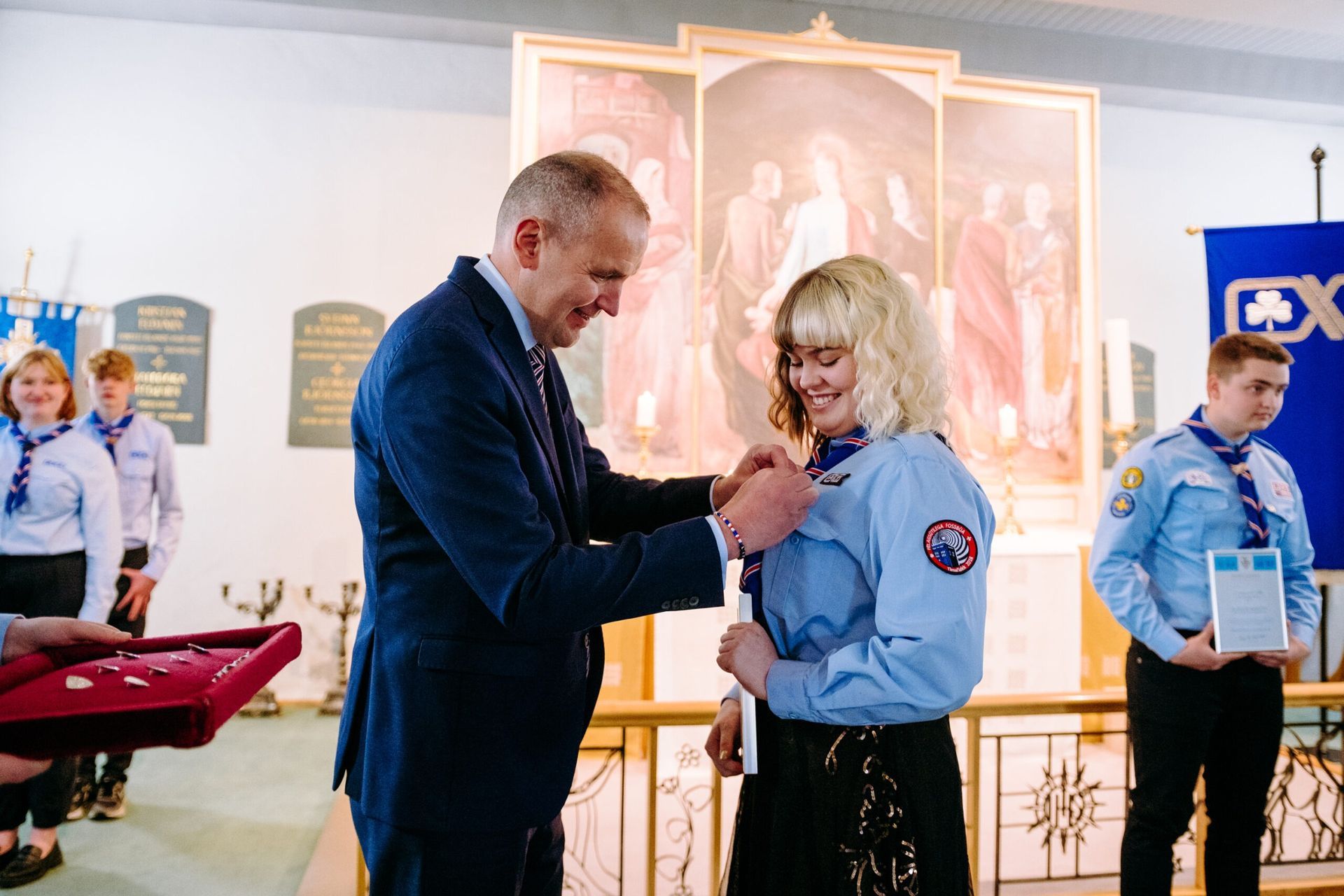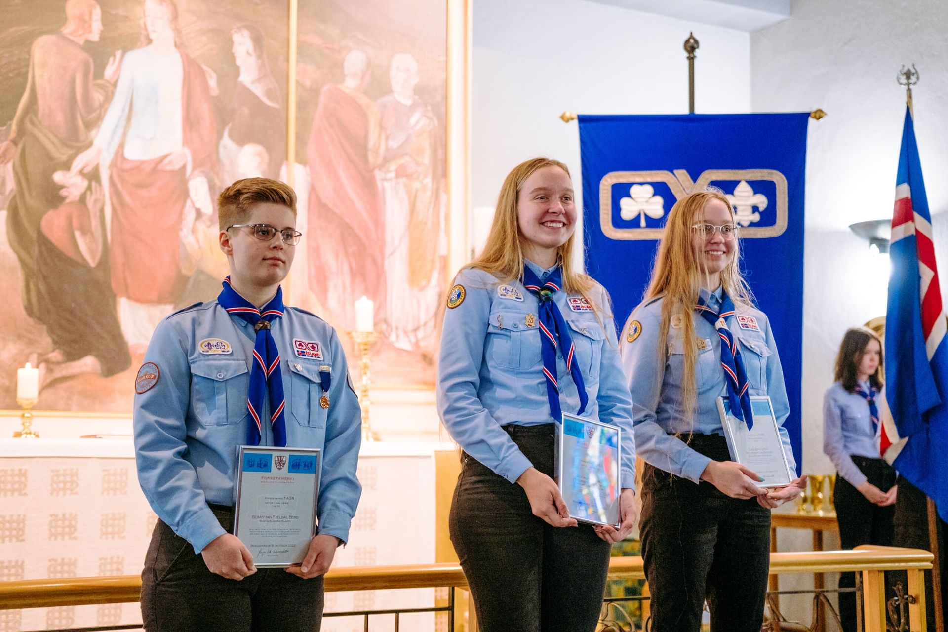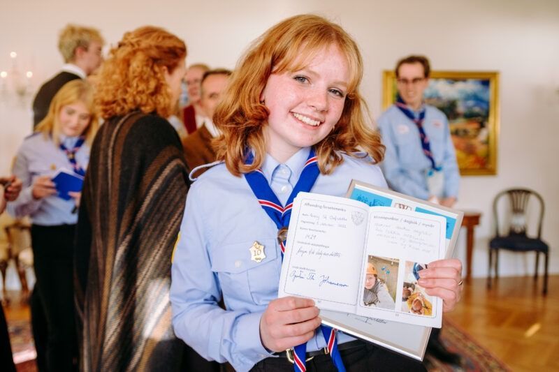 Að lokinni afhendingu var haldið til Bessastaðastofu þar sem skátahöfðingi sagði nokkur orð áður en boðið var upp á veitingar.