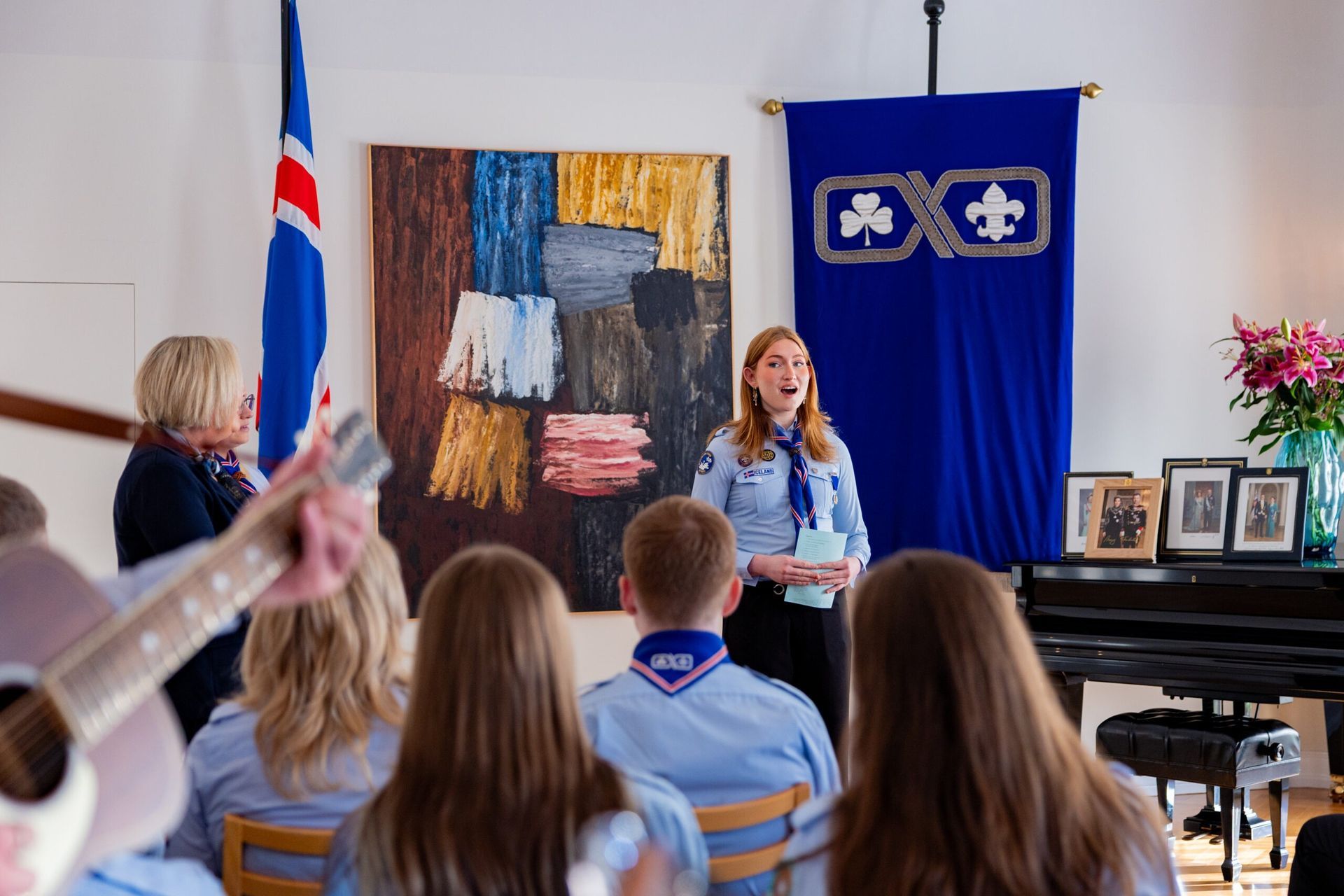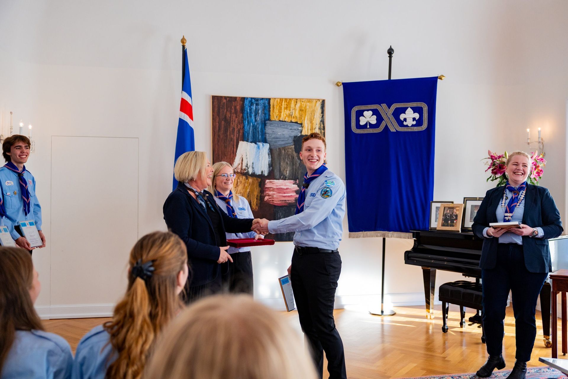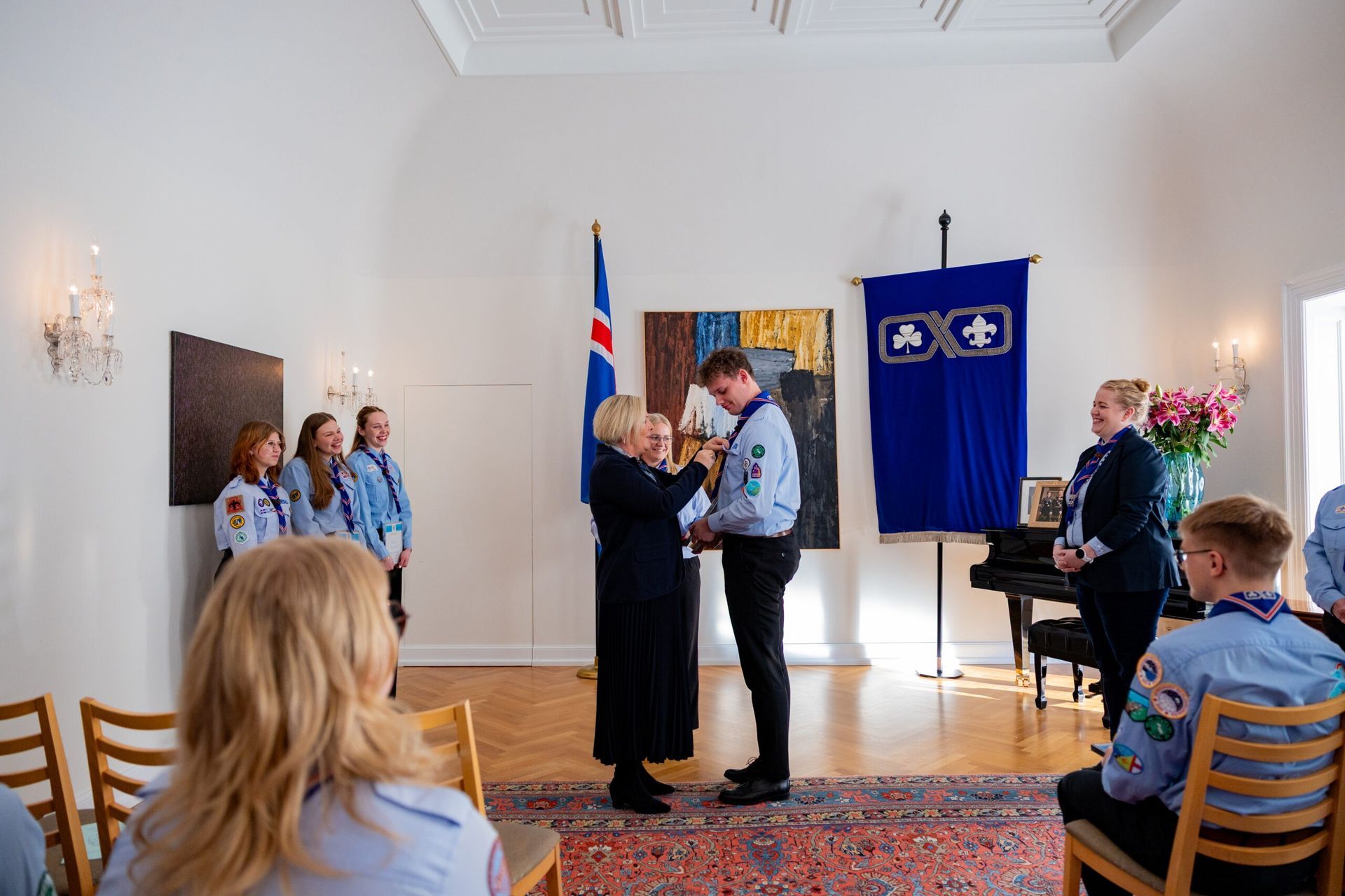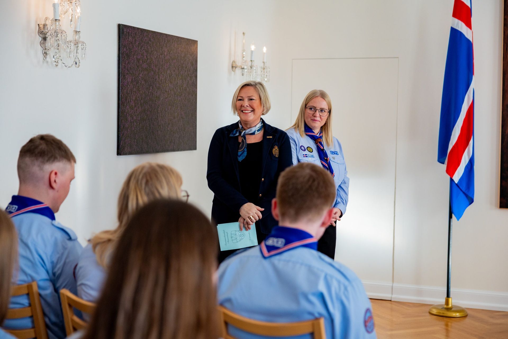 Fríða: Ég hef oft verið spurð hvað það er eiginlega sem við gerum í skátunum. Fólk virðist halda að við séum að kveikja eld og hnýta hnúta alla fundi en öll hér inni vitum við að skátastarfið er svo miklu meira en það. Skátahreyfingin er eina æskulýðshreyfingin, svo ég best viti, sem er með eitt inntökuskilyrði: Að leggja sitt af mörkum til þess að bæta samfélagið. Þótt við kveikjum vissulega marga elda þá áttar maður sig á því að skátastarfið snýst ekki bara um eldinn sjálfann, heldur um það að kveikja eld innra með sér og öðrum. Að verða forvitin, þrautseig, opin fyrir ævintýrum og tilbúin að takast á við áskoranir. Núna, þegar ég stend hér í dag, finnst mér eins og þessi eldur logi aðeins skærar.