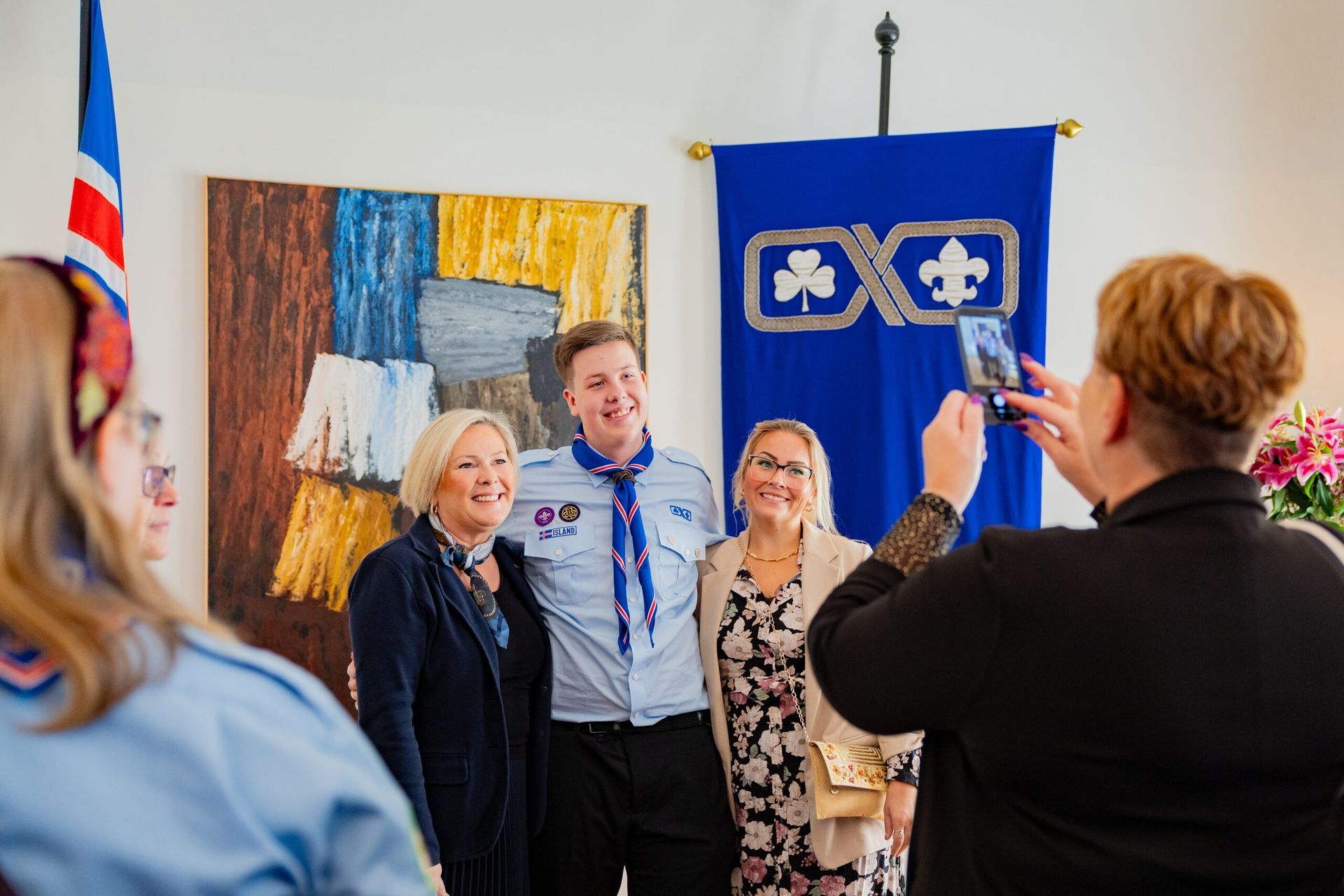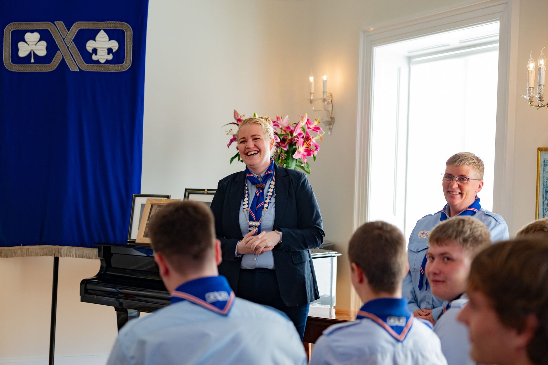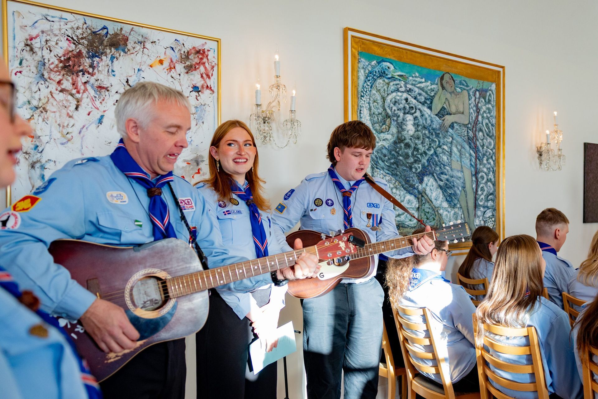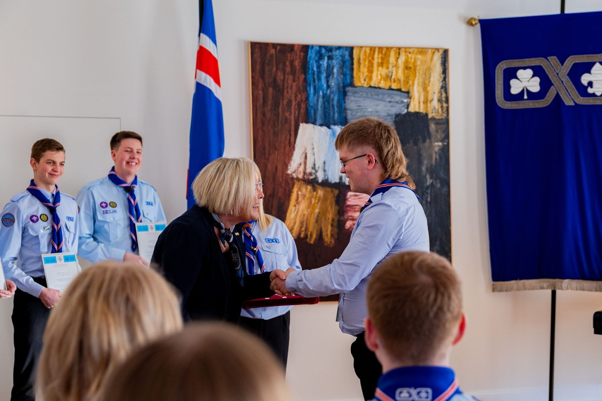 Fríða: Ég hef oft verið spurð hvað það er eiginlega sem við gerum í skátunum. Fólk virðist halda að við séum að kveikja eld og hnýta hnúta alla fundi en öll hér inni vitum við að skátastarfið er svo miklu meira en það. Skátahreyfingin er eina æskulýðshreyfingin, svo ég best viti, sem er með eitt inntökuskilyrði: Að leggja sitt af mörkum til þess að bæta samfélagið. Þótt við kveikjum vissulega marga elda þá áttar maður sig á því að skátastarfið snýst ekki bara um eldinn sjálfann, heldur um það að kveikja eld innra með sér og öðrum. Að verða forvitin, þrautseig, opin fyrir ævintýrum og tilbúin að takast á við áskoranir. Núna, þegar ég stend hér í dag, finnst mér eins og þessi eldur logi aðeins skærar.