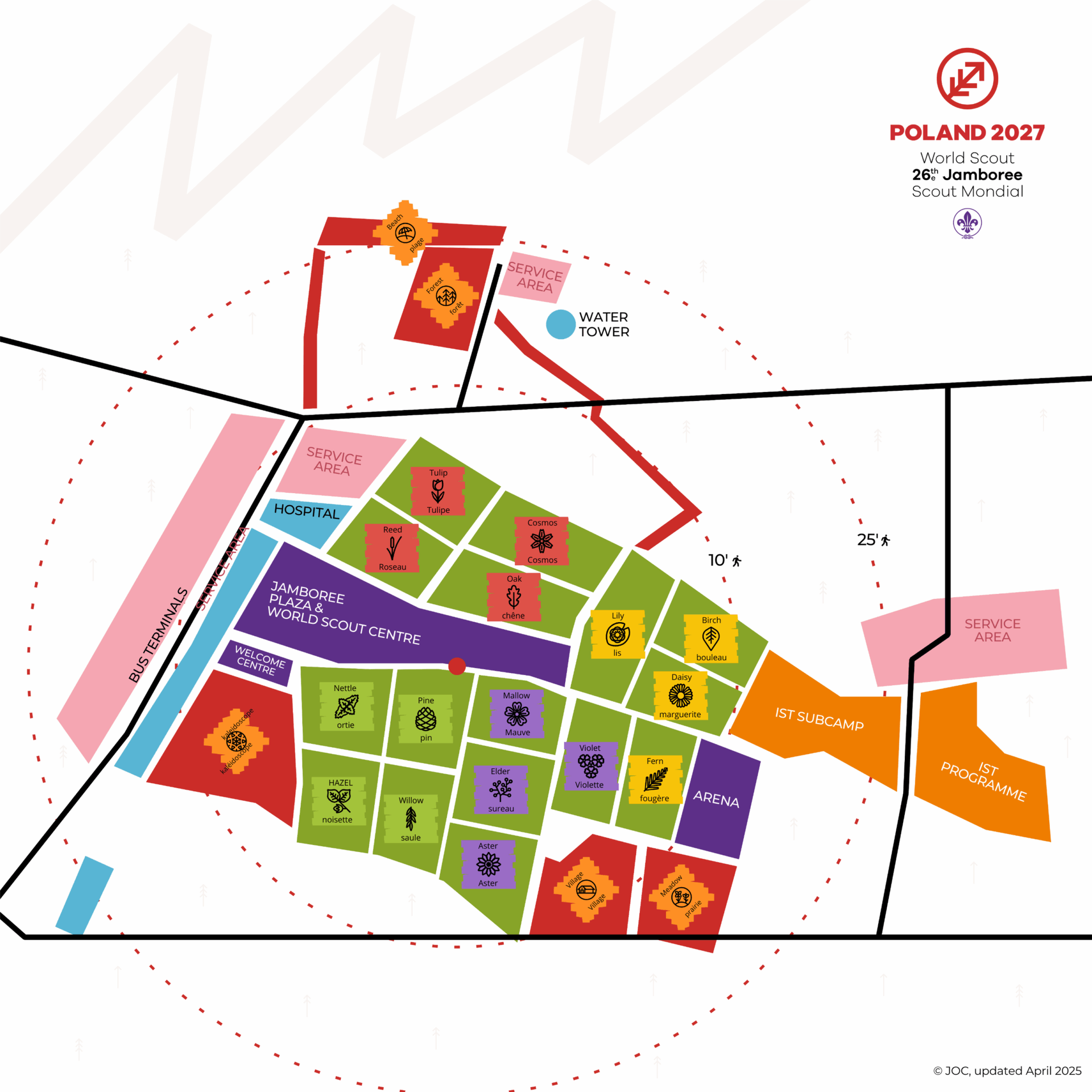 Hvert þorp samanstendur af fjórum tjaldsvæðum sem þýðir að þátttakendum er dreyft á 16 mismunandi tjaldsvæði sem heita eftir pólskum plöntum og blómum. Rúmlega 2.250 skátar munu gista á hverju tjaldsvæði sem skiptast í rúmlega 56 sveitir.