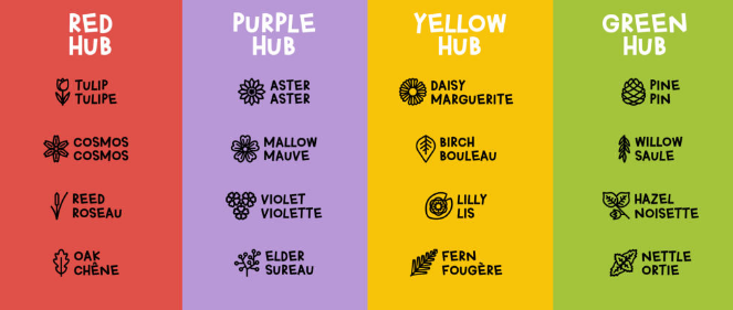 Tjaldbúðinni er skipt í fjögur þorp sem eru flokkuð eftir litum, rauða þorpið, fjólubláa þorpið, gula þorpið og græna þorpið.