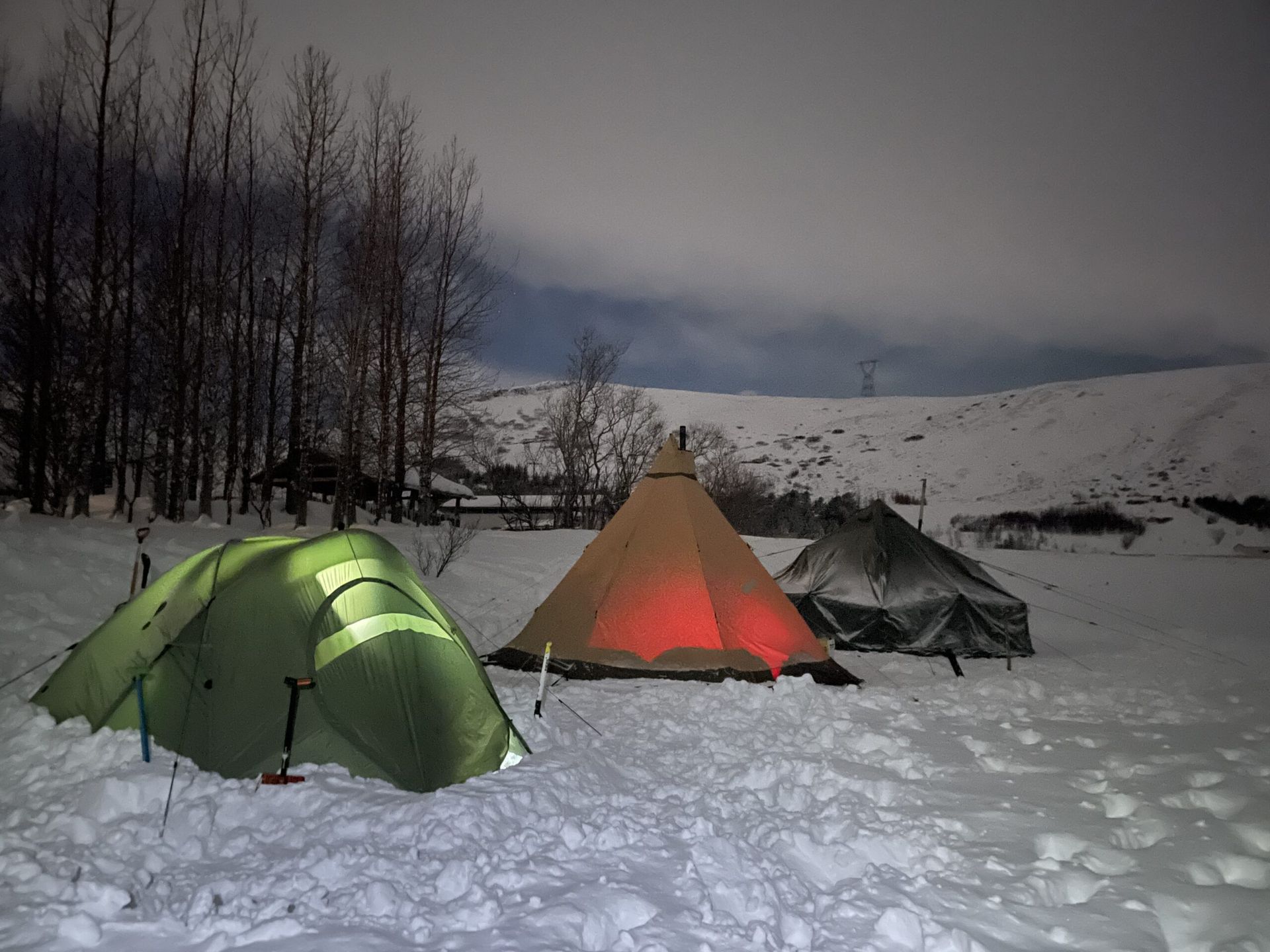 Tjöld sett upp í milli stórhríða