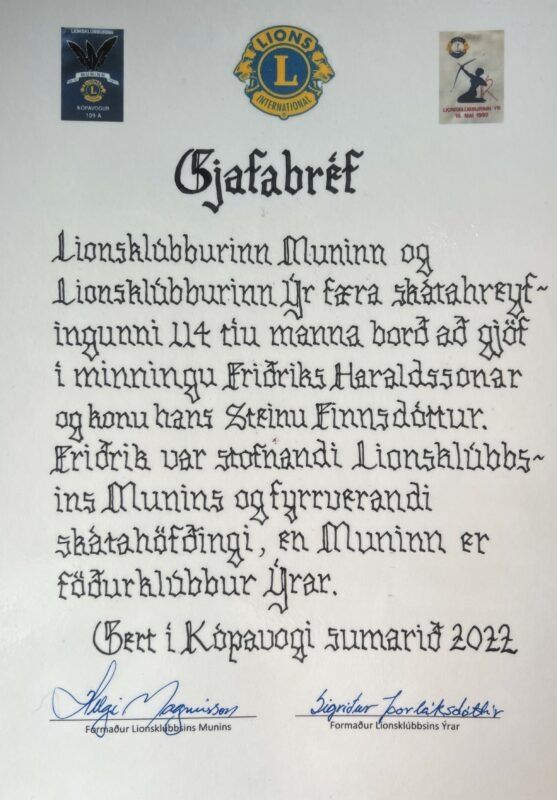 Lionsklúbburinn Muninn og Lionsklúbburinn Ýr færðu Skátunum að gjöf 114 gerðarleg borð með samanfellanlegum fótum í minningu hjónanna Friðriks Haraldssonar og Steinu Haraldsdóttur. Þessi borð munu koma sér vel víða um land hjá skátafélögunum sem og á Úlfljótsvatni. Skátahreyfingin sendir þeim miklar þakkir fyrir!