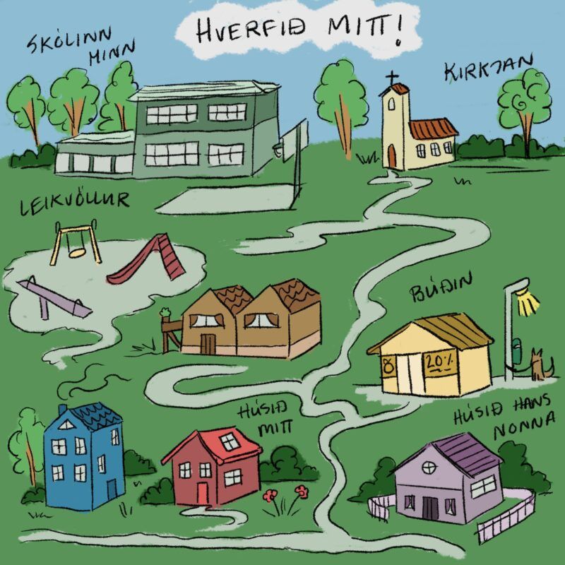 - skref: Taktu þér blað og blýant og teiknaðu upp kort af götunni eða hverfinu þínu! Settu inn alla staði sem þér finnast vera mikilvægir, t.d. skólinn þinn, strætóskýli, vinir þínir, húsið þitt, skemmtilegar leynileiðir o.s.fv.
