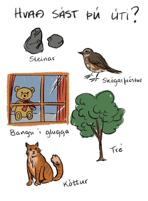 Ef þú vilt, þá getur þú tekið blað og blýant með þér og teiknað það sem þú finnur úti! Ef ekki þá getur þú annað hvort tekið með þér eitthvað inn eins og t.d. steina eða munað hvað þú sást úti og teiknað það þegar þú kemur inn.