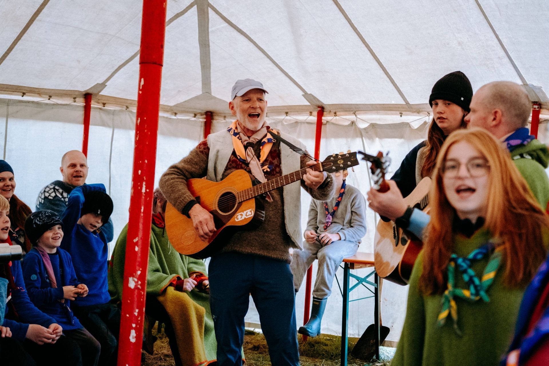 Guðni Gíslason á kvöldvöku Hraunbúa á Landsmóti 2024 með sama gítar og á Landsmóti 1974